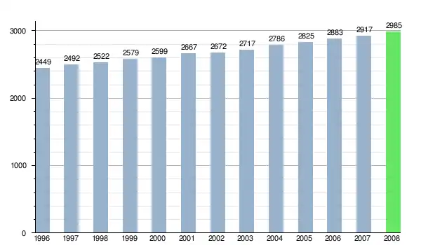 Według danych z dnia 31 grudnia 2012, wieś zamieszkiwało 3110 osób, w tym 1550 kobiet i 1560 mężczyzn[6].