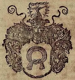- ↑ Jan Aleksander Gorczyn: Kleynoty abo herby państwa y rycerstwa powiatow y miast głownych Korony Polskiey y W. X. L. według obiecadła dla pamięci łacnieyszey położone. Kraków: Aleksander Dymowski, 1630, s. 67.