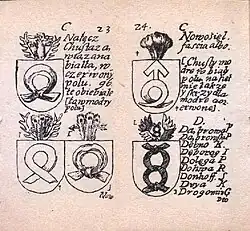 - ↑ Np. w: Paweł Dudziński: Alfabet heraldyczny. Warszawa: Diogenes, 1997. ISBN 83-7129-476-X.