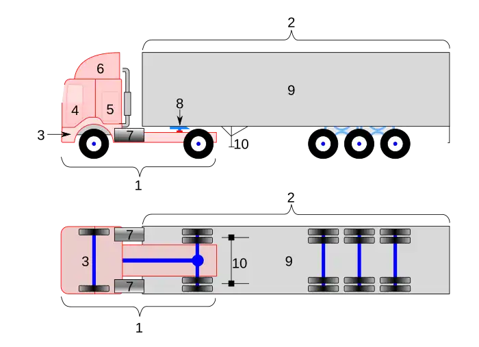 Ciągnik siodłowy z naczepą połączony jest za pomocą sprzęgu siodłowego[4] (połączenie sworzniowe).