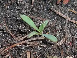 - Nasiona kiełkują epigeicznie[8] wiosną[25] w różnym czasie w zależności od tego, kiedy siedlisko odsłonią opadające wody[8]. Hipokotyl jest nagi i osiąga do 1 cm długości. Dwa liścienie są równowąskie o długości do 6 mm, u nasady klinowate ściągnięte w ogonek długości do 3 mm. Epikotylu brak. Pierwsza para liści właściwych równowąska o długości do 15 mm i ogonkiem do 3 mm. Liście i liścienie są nagie, całobrzegie, o wierzchołkach ± zaokrąglonych[25].