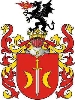 Klejnot – smok czarny, ziejący ogniem, z godłem w prawo na płomieniu.
