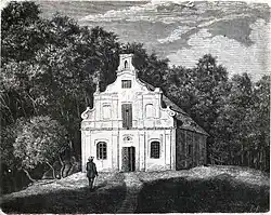 Możliwe, że opisany niżej lamus był kościołem kalwińskim[3], obrócony na składy a w części na mieszkanie, otrzymał z czasem nazwę skarbca, pod jaką i dziś pozostaje (tj. w 1895 roku).