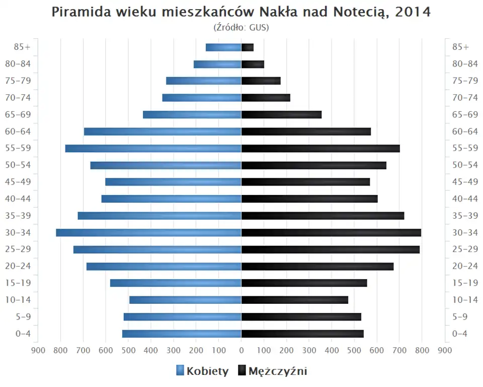 - Piramida wieku mieszkańców Nakła nad Notecią w 2014 roku[16].