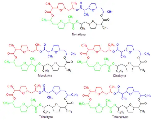 Najprostszym związkiem z tej grupy jest nonaktyna, natomiast homologami nonaktyny są: monaktyna, dinaktyna, trinaktyna oraz tetranaktyna.