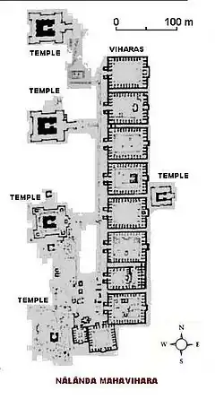 Nalanda była najprawdopodobniej największym, buddyjskim zespołem klasztornym swoich czasów[14], a na miejsce jej budowy wybrano, należący wcześniej do bogatego kupca, gaj mangowców. Kompleks stanowiły budynki mieszkalne, świątynie, stupy, a cały obszar otoczony był murem z jedną bramą wjazdową. Pomimo tego, że budowa rozciągnięta była w czasie i trwała tak naprawdę przez cały okres funkcjonowania klasztoru, rozmieszczenie budynków zdradza planowość i poszanowanie pierwotnego założenia. Wielkie, uformowane w rząd budynki klasztorne, w liczbie prawdopodobnie większej niż jedenaście, stanowiły jego główny trzon. Wszystkie były do siebie podobne, posiadały centralny ganek i wspólny taras, a każdy z nich był najprawdopodobniej wielopiętrowy (o czym zdają się świadczyć klatki schodowe). Na ich wyposażeniu znajdowały się studnie, kuchnie oraz spiżarnie, a także miejsce wspólnych praktyk. Naprzeciw umieszczono świątynie z licznymi stupami[1][16][17].