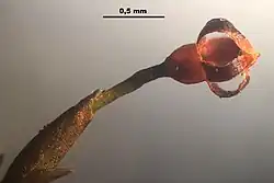 - Wyrasta na pseudopodium (brak sety podobnie jak u torfowców). Puszka zarodni oddzielona jest od stopy tylko krótkim przewężeniem. Sama zarodnia jest okryta drobnym czepkiem i otwiera się czterema (rzadko 8[5]) podłużnymi szczelinami[3], powstającymi wzdłuż szeregów słabszych komórek[7]. Wewnątrz zarodni znajduje się kolumienka okryta woreczkiem zarodnikowym, przylegającym też do ścian zarodni (brak przestworów powietrznych)[5].