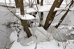 Może także powstawać na rzece lub jeziorze, wtedy woda jest wyciskana spod pokrywy lodowej tworząc nad nią druga taflę. W takim przypadku pomiędzy dwoma płaszczyznami zmarzliny często gromadzi się woda. Zjawisko to spotykane jest m.in. na Syberii.