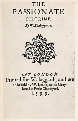 Namiętny pielgrzym został opublikowany przez Williama Jaggarda, późniejszego wydawcę Pierwszego Folio. Edycja poszerzona, wydana w 1612 roku, zawierała utwory Thomasa Heywooda, którego protesty zmusiły wydawcę do wycofania się z przypisywania ich Szekspirowi.