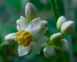 - Drobne (długości od 5 do 7 mm), wonne, zebrane setkami w kwiatostany o długości od 10 do 20 cm na szczytach pędów. Kwiaty trzykrotne, obupłciowe. Działki kielicha liczne, ułożone spiralnie. Płatki korony kremowe i białe, dłuższe od działek kielicha. Pręciki w liczbie 6, z żółtymi pylnikami. Zalążnia owalna, słupek pojedynczy, krótki[6][7].