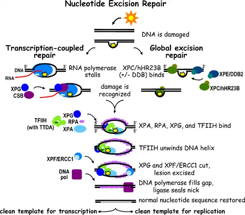 Mechanizm NER usuwa duże uszkodzenia DNA zniekształcające strukturę podwójnej helisy (ang. bulky distortions). W pierwszym etapie NER uszkodzenie jest rozpoznawane na drodze niezależnej od ATP przez białko XPA, po którym następuje zależny od ATP etap formowania kompleksu „preincision”. Do białek wchodzących w skład kompleksu mogą należeć XPC, XPB i XPD, chociaż niewykluczone że część z nich może odgrywać rolę czynników rekrutujących i oddysocjowywać po utworzeniu kompleksu. Następnie duży fragment DNA (około 30 par zasad) jest usuwany przez nukleazę wycinającą (endonukleazę). Endonukleaza (XPG, XPF) nacina nić DNA w dwóch miejscach, kolejność 3’ czy 5’ jest losowa. Następnie usunięty odcinek jest zastępowany na drodze dokładnego parowania zasad, dzięki aktywności enzymu polimerazy DNA δ albo polimerazy ε, w obecności PCNA i RFC. Proces syntezy naprawczej kończy reakcja ligazy, łączącej końce wstawki z resztą nici DNA.