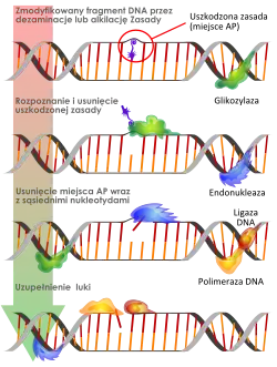 Pojedyncze zasady w DNA mogą być modyfikowane chemicznie, np. przez deaminację czy alkilację, co powoduje niewłaściwe parowanie zasad, a w konsekwencji wprowadzenie mutacji w DNA. Naprawa przez wycinanie zasady polega na wycięciu zmutowanej zasady z helisy DNA i jej naprawę. W procesie biorą udział dwa typy enzymów, glikozylazy DNA i endonukleazy AP. Glikozylaza DNA przecina wiązanie β-N glikozydowe między uszkodzoną zasadą a cząsteczką deoksyrybozy, tworząc miejsce apurynowe/apirymidynowe. Endonukleaza AP rozpoznaje to miejsce i nacina DNA w kierunku 5' od miejsca AP tworząc wolny koniec 3'-OH. Polimeraza DNA, Pol I, wydłuża nić DNA od wolnego końca 3'-OH wykorzystując aktywność egzonukleazy do zastąpienia nukleotydu z uszkodzoną zasadą oraz kilku następnych. Następnie nowa nić jest łączona ze starą za pomocą ligazy DNA.