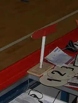 Dawniej często spotykane były strzałki drewniane. Obecnie stosuje się głównie strzałki elektryczne. Włączona strzałka powinna świecić się na kolor jasnoczerwony, wskazując odpowiedni kierunek naprzemiennego posiadania piłki[15].