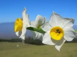 - Pachnące, pojedynczy ma długość 3–5 cm, białe, szerokojajowate płatki okwiatu i żółty przykoronek o szerokości dwukrotnie większej od wysokości[6].