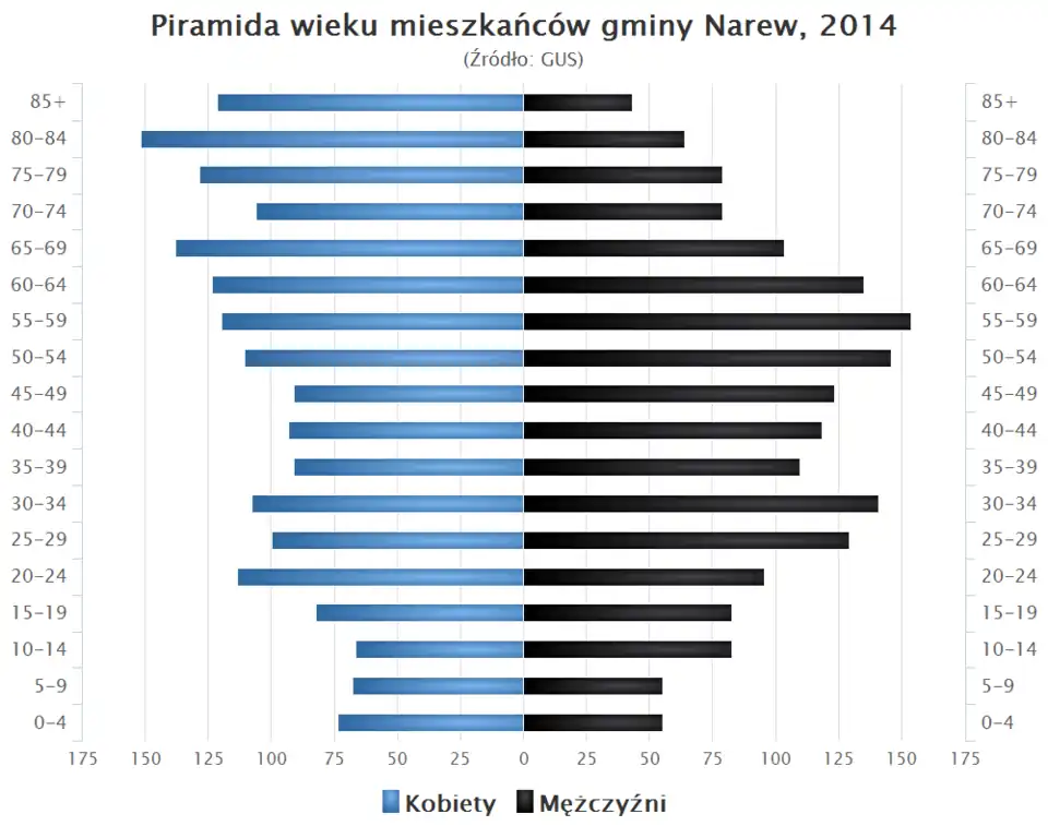 - Piramida wieku mieszkańców gminy Narew w 2014 roku[1].