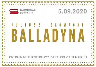 Na dziewiątą edycję Narodowego Czytania, która odbyła się 5 września 2020 roku, wybrano Balladynę, sztukę Juliusza Słowackiego. Wybrano dzieło Słowackiego ze względu na jego wybitność pośród innych dzieł polskiego romantyzmu. Rękopis ocalał w czasie II wojny światowej, odnaleziony w Tyrolu, w 1946 roku trafił do Biblioteki Narodowej. Balladyna ma odwołania do polskiej tradycji, folkloru oraz, jak to powiedział w swoim okolicznościowym przemówieniu prezydent Andrzej Duda w Ogrodzie Saskim, „do mitycznych początków państwa polskiego”[17].