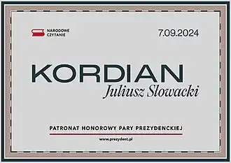 - ↑ Prezydent: Lekturą Narodowego Czytania w 2024 r. będzie „Kordian”, [w:] TVP Parlament [online], tvpparlament.pl, 10 września 2023 [dostęp 2024-03-05] (pol.).