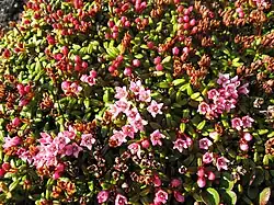 - Zebrane po 2–5 w kwiatostany, rozwijają się na szczytach pędów. Osadzone są na krótkich szypułkach. Mają 5 działek kielicha o czerwonawej barwie. Płatki są zrośnięte u nasady, mają różową barwę, są szeroko rozpostarte, nieco zaostrzone przy wierzchołku, dorastają do 5–6 mm szerokości[5].