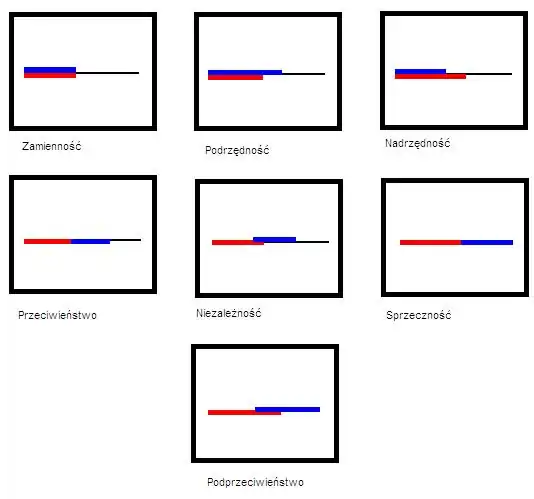 Stosunek przeciwieństwa i stosunek sprzeczności między zakresami nazw określa się łącznie jako stosunek wykluczania się zakresów nazw: w przypadku sprzeczności suma zakresów nazw sprzecznych tworzy klasę uniwersalną przedmiotów, w przypadku przeciwieństwa jej podzbiór. Nazwa "krowa" i nazwa "rzeka" są przeciwne, nie istnieją bowiem przedmioty będące jednocześnie rzekami i krowami — nie są jednak sprzeczne, gdyż istnieją przedmioty nie będące ani krowami, ani rzekami, jak np. ludzie, drzewa i miasta. Stosunek niezależności i podprzeciwieństwa między zakresami nazw określa się łącznie jako stosunek krzyżowania się zakresów nazw: w suma denotacji nazw podprzeciwnych pokrywa się z uniwersum przedmiotów, suma denotacji nazw niezależnych nie pokrywa się z nim.