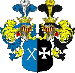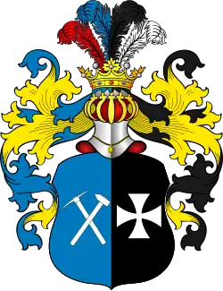 Wersja Edler: Na tarczy dwudzielnej, w polu I błękitnym młot i kilof srebrne skrzyżowane w skos; w II czarnym - krzyż kawalerski srebrny. Klejnot: cztery pióra strusie: czerwone, błękitne, czarne, srebrne.