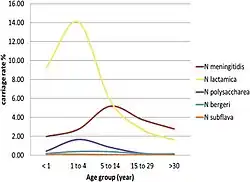 Gatunek ten przenoszony jest głównie przez dzieci poniżej 5 roku życia[65][66][69][70]. W Burkinie Faso najwięcej przypadków N. lactamica zostało wykrytych wśród dwulatków (40%)[64], zazwyczaj jednak szczyt infekcji obserwowany jest u jeszcze młodszych dzieci, poniżej jednego roku życia[62][65][71]. We wszystkich badaniach obserwuje się gwałtowny spadek w nosicielstwie N. lactamica po szczycie przypadającym na wczesne dzieciństwo[69]. W północnej Nigerii na przykład nosicielstwo N. lactamica zmalało z około 50% u dzieci poniżej 1 roku życia do zaledwie 5% u dorosłych powyżej 20 roku życia[65]. W Polsce badanie nosicielstwa N. lactamica w Zielonce pokazało, że była to najczęściej występująca bakteria z rodzaju Neisseria wśród dzieci w wieku przedszkolnym[72]. Infekcje meningokoków są, z kolei, najbardziej powszechne u nastolatków i młodych dorosłych[63].