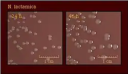 N. lactamica może być z powodzeniem przetrzymywana na selektywnym podłożu Thayera-Martina stosowanym do hodowli gonokoków[8], jednak w przeciwieństwie do nich do wzrostu nie wymaga zewnętrznego źródła CO2 i rośnie w niższych temperaturach – od 22 do 25 stopni[9]. Hodowla bakterii możliwa jest również na nieselektywnych podłożach takich jak agar z krwią, na którym niektóre szczepy zdolne są do hemolizy[10], a także na specjalnym podłożu LBVT.SNR służącym do hodowli komensalnych gatunków Neisseria[11]. Większość szczepów do wzrostu wymaga aminokwasu cysteiny[12]. Tworzy żółtawe, albo bezbarwne gładkie kolonie, zazwyczaj mniejsze (o średnicy 1,5–2,5 mm po 48 godzinach hodowli[12]) i mniej wilgotne od kolonii N. meningitidis[8][10]. W płynnej kulturze gatunek wykazuje skłonności do agregacji[5], a także cechuje się niższym tempem wzrostu niż gonokoki i meningokoki[13]. Jest gatunkiem bardzo łatwym do zidentyfikowania, dzięki jego przystosowaniu do fermentacji laktozy oraz wytwarzania β-D-galaktozydazy, niespotykanym u innych przedstawicieli rodzaju Neisseria[8]. W celu zidentyfikowania N. lactamica do pożywki dodaje się związek organiczny X-gal, który po hydrolizie katalizowanej przez bakteryjną β-D-galaktozydazę wytwarza produkt reakcji nadający koloniom N. lactamica niebieski kolor pozwalający na ich łatwą identyfikację[14]. Opisany został przypadek jednego szczepu niezdolnego do fermentacji laktozy[8]. W przeciwieństwie do N. meningitidis, N. lactamica nie jest zdolna do autoaglutynacji, w związku z czym nie może zostać podzielona na grupy serologiczne[5].