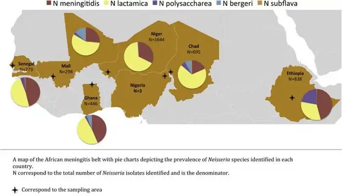 Duża część informacji dotyczących epidemiologii N. lactamica pochodzi z tzw. pasa meningokowego – regionu w Afryce Subsaharyjskiej charakteryzującego się bardzo dużą zapadalnością na zapalenie opon mózgowo-rdzeniowych[60]. W tym regionie Neisseria lactamica przenoszona jest średnio przez 5,6% badanej populacji w porównaniu z 4,5% dla meningokoków[61], przy czym w południowej Etiopii N. lactamica została wykryta u aż 28% uczestników badania[62]. W badaniu przekrojowym N. lactamica była najczęściej wykrywalną bakterią w 6 na 7 krajach afrykańskich[63]. Należy również zaznaczyć, że w niektórych przypadkach procent nosicieli N. lactamica może być nieznacznie zawyżony, co pokazało badanie w Burkinie Faso, gdzie 2% izolatów N. lactamica zostało zidentyfikowanych jako meningokoki w zewnętrznej kontroli[64].