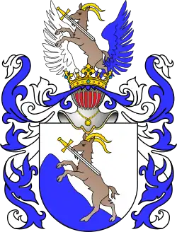 Klejnot – kozioł (sarna), jak w godle, między dwoma skrzydłami – z prawej srebrnym, z lewej błękitnym.