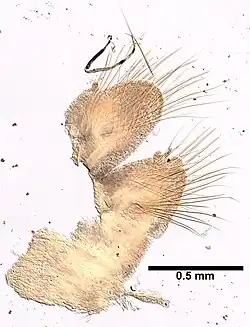 Wieloszczet ten ma niewielką, prostokątną w zarysie, zaopatrzoną w parę krótkich, osadzonych w kątach przednich czułków głowę[5]. Gardziel tworzy wywracający się na zewnątrz ryjek[5] z 22 papillami[6]. Formy dorosłe mają co najmniej kilkadziesiąt segmentów zaopatrzonych w skrzela. Formy młodociane mogą mieć ich mniej, ale doszukać się u nich można strefy wzrostu z licznymi nowymi segmentami, położonej tuż przed pygidium. Skrzela zaczynają się między ósmym a dwunastym segmentem (rzadko od segmentu siódmego) i odgięte są na zewnątrz. Parapodia mają notopodia w przypadku środkowych segmentów zaopatrzone w długie cirrusy. Neuropodia co najmniej na segmentach środkowej i tylnej części ciała mają płaty zaszczecinkowe niemal takich samych rozmiarów jak acikularne. Neuropodia segmentów środkowych za segmentem dwudziestym mają płaty acikularne wyraźnie rozdwojone[7].