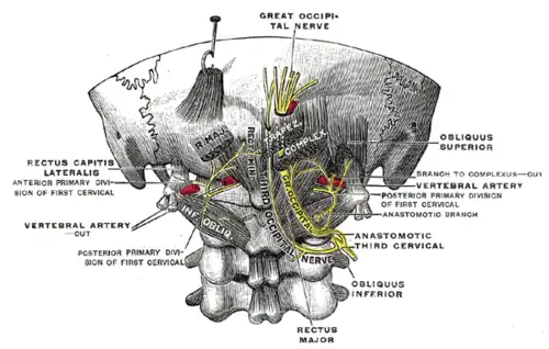 Punkt wyjścia nerwu potylicznego większego znajduje się między tylnym łukiem kręgu szczytowego, a kręgiem obrotowym. Pod dolną krawędzią mięśnia skośnego dolnego głowy nerw dzieli się na dwie gałęzie: boczną oraz przyśrodkową. Gałąź boczna unerwia mięśnie, a następnie zespala się z nerwem potylicznym trzecim (gałęzią grzbietową trzeciego szyjnego nerwu rdzeniowego). Gałąź przyśrodkowa (właściwe przedłużenie nerwu) zawija się wokół mięśnia skośnego dolnego głowy i biegnie w górę przykryta mięśniem półkolcowym głowy, następnie przebija go oraz ścięgno mięśnia czworobocznego i przedostaje się do tkanki podskórnej. Na końcowym odcinku podąża ku górze wraz z tętnicą potyliczną i dzieli się na końcowe gałęzie, które zaopatrują skórę okolicy potylicznej i ciemieniowej[1].