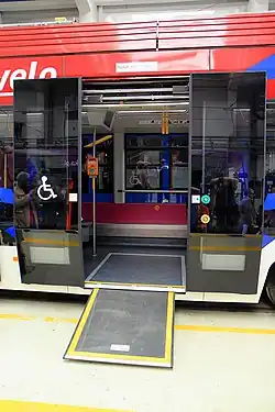Pierwsze drzwi dwupłatowe są wyposażone w umieszczoną w podłodze automatycznie wysuwaną rampę ułatwiającą dostęp do tramwaju osobom poruszającym się na wózkach inwalidzkich i osobom z wózkami dziecięcymi[4][19].