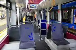 Pojazd może pomieścić 60 pasażerów na siedzeniach z tapicerowanymi wandaloodpornymi siedziskami i oparciami[4]. W tramwaju znajdują się również dwa miejsca z pasami bezpieczeństwa dla osób niepełnosprawnych[19], a także miejsca dla osób z wózkami dziecięcymi i większym bagażem[4].
