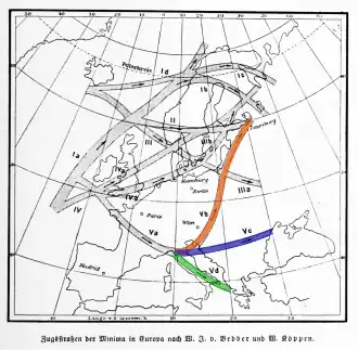 Wilhelm Jakob van Bebber zidentyfikował trzy główne szlaki, którymi podążają niże genueńskie, klasyfikując szlaki ośrodków niskiego ciśnienia w Europie („Zyklonenbahnen” po niemiecku) w 1891 roku[6]. Do dzisiaj szlak V z tej grupy pozostaje w powszechnym użyciu, w przeciwieństwie do większości innych szlaków van Bebbera[6]. Szlak Vb (Piąty b) wiąże się z powodziami w Europie Środkowej i Wschodniej[12][13].