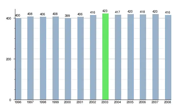 Według danych z dnia 31 grudnia 2012, wieś zamieszkiwało 438 osób, w tym 233 kobiety i 205 mężczyzn[6].
