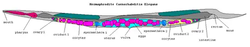 Schemat przedstawiający anatomię nicieni na przykładzie Caenorhabditis elegans