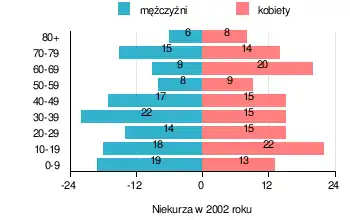 Współczesna struktura demograficzna wioski Niekurza na podstawie danych z lat 1995–2009 według roczników GUS-u, z prezentacją danych z 2002 roku[20]: