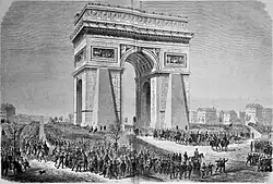 Pozostała część 30 000 żołnierzy paradowała przed Wilhelmem I, niedawno ogłoszonym cesarzem niemieckim, na hipodromie Longchamp poza miastem. Wojska te wkroczyły do Paryża około 10:30[8][5] i paradowały Polami Elizejskimi około godziny 15:00 przy dźwiękach fujarek i bębnów[8][5]. Obywatele Paryża próbowali zablokować Łuk Triumfalny, ale czołowe oddziały niemieckiej kawalerii zdołały przez niego przejść[5]. Niektóre źródła błędnie twierdzą, że przez Łuk Triumfalny nie odbył się przemarsz[9]. W paradzie uczestniczyły oddziały armii pruskiej, bawarskiej i saskiej, a oglądał ją milczący i wściekły paryski tłum[9]. Armia niemiecka maszerowała w szyku bojowym, a nie paradnym[8].