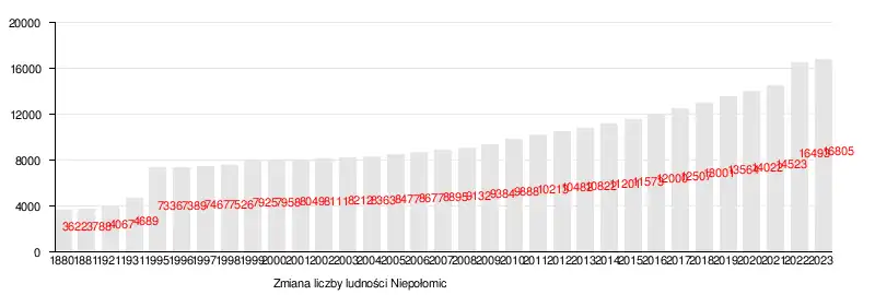 Według austriackiego spisu ludności z 1900 w 622 budynkach w Niepołomicach na obszarze 1899 hektarów mieszkały 4692 osoby, z czego 4122 (87,9%) było katolikami, 507 (10,8%) wyznawcami judaizmu, 12 (0,3%) grekokatolikami, a 50 (1,1%) innej religii lub wyznania, 4426 (94,3%) było polsko-, 152 (3,2%) niemiecko-, 3 (0,1%) rusko-, a 102 (2,2%) innojęzycznymi[10].