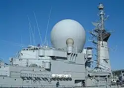 - trójwspółrzędna stacja radiolokacyjna dozoru powietrznego DRBI 23 (w kulistej osłonie na nadbudówce dziobowej)