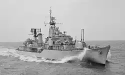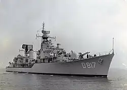 - ↑ Załoga 284 według Conway’s All the world’s fighting ships 1947–1995 ↓, s. 274 i Jane’s Fighting Ships 1975-76 ↓, s. 245, natomiast Cabo 1995 ↓, s. 29 i za nim Zawadzki 2020 ↓, s. 42 podaje załogę 283 osób