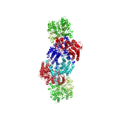 Nitrogenaza – enzym bakteryjny związany z asymilacją azotu. Jest to białko złożone zawierające centrum żelazowo-siarkowe i molibden[2], rzadziej wanad[3]. Jest zbudowana z dwóch typów jednostek białkowych. Jednostka większa, tzw. białko FeMo, składa się z 4 łańcuchów polipeptydowych w układzie α2β2 i zawiera kofaktor FeMo (z atomami żelaza i molibdenu). Po jej przeciwnych stronach przyłączone są 2 mniejsze białka żelazowe[1].