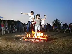 Ogniska rozpalano późnym wieczorem i płonęły one najczęściej do rana. W różnych tradycjach istnieją dowody na wymóg rozpalania ogniska Kupały „żywym ogniem”, wytwarzanym przez tarcie[69]; w niektórych miejscach ogień był przenoszony do domu i rozpalany w palenisku. Wszystkie kobiety z wioski musiały podejść do ognia, ponieważ każda, która nie przyszła, była podejrzewana o czary[70]. Wokół ogniska prowadzono korowód, tańczono, śpiewano pieśni kupalne, przeskakiwano przez ognisko: kto skoczy z większym powodzeniem i wyżej, będzie szczęśliwszy[71]. Dziewczęta przeskakują nad ogniem, aby „oczyścić się i uchronić przed chorobami, zepsuciem, zaklęciami” oraz aby „rusałki nie atakowały i nie przychodziły w ciągu roku”[72]. Dziewczynę, która nie przeskoczyła przez ogień, nazywano czarownicą (Słowianie Wschodni, Polska); oblewano ją wodą i biczowano pokrzywami, ponieważ nie została „oczyszczona” przez ogień chrzcielny[73]. W guberni kijowskiej dziewczyna, która straciła dziewictwo przed zamążpójściem, nie mogła przeskoczyć przez ognisko podczas Nocy Kupały, ponieważ w ten sposób zbezcześciłaby je[74].