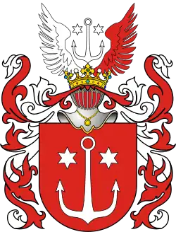 W polu czerwonym kotwica srebrna między dwiema takimiż gwiazdami.