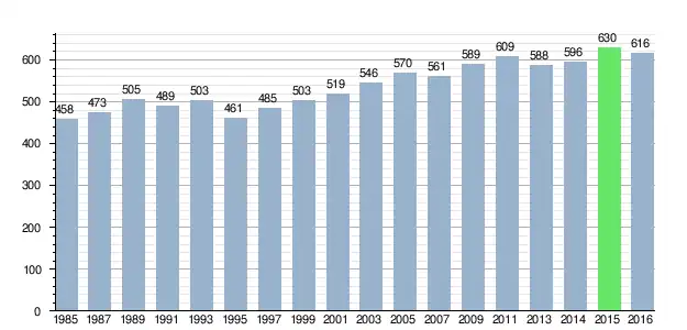 Według szacunków na 1 stycznia 2016 roku we wsi zamieszkuje 616 osób[1]. Sprawia to, że jest to dwudziesta największa miejscowość na Wyspach Owczych, siódma na Eysturoy i druga w gminie Eysturkommuna[1]. Współczynnik feminizacji społeczeństwa wynosi prawie 88 kobiet na 100 mężczyzn[1]. Społeczeństwo jest młode, ponad 28% ludności stanowią osoby w wieku przedprodukcyjnym, podczas gdy ludzie powyżej 65 roku życia to 14,2%[1].