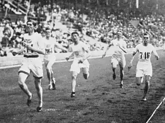 Finał biegu na 1500 m podczas olimpiady w Sztokholmie (1912), pierwszy z prawej: Norman Taber.