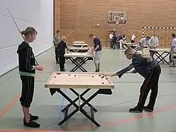 Kwadratowy stół jest podzielony na cztery pola do gry, w dwóch z nich rozmieszcza się drewniane krążki w dwóch kolorach, po jednym zestawie dla każdego z graczy[5]. W rogach stołu znajdują się cztery łuzy[5]. Zadaniem każdego gracza jest wbicie swoich krążków, znajdujących się początkowo po przeciwnej stronie stołu, do obojętnie której z czterech łuz[5]. Gracze w tym celu używają kija i dodatkowego krążka, nieco większego od pozostałych[5]. Uderzenia w krążki odbywają się na przemian, gracza rozpoczynającego partię wybiera się za pomocą rzutu monetą[5]. Zwycięża ten, kto pierwszy wbije wszystkie swoje krążki do łuz[5].