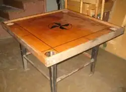 Do produkcji stołów wykorzystywane jest naturalne drewno. Stół wykonuje się ze sklejki o grubości 9 mm dla stołów standardowych i nie mniej niż 15 mm dla stołów profesjonalnych. Banda wokół niego wykonana jest z bezsękowych desek brzozowych, bukowych lub z innego drewna o podobnych właściwościach. Boki stołu powinny być połączone na pióro-wpust. Banda stołu powinna mieć zamek dla płaszczyzny sklejki, tj. płaszczyzny stołu. Właśnie takie połączenie zamkowe i boczny zamek dla sklejki pozwala konstrukcji stołu być mocną samonośną konstrukcją, która wytrzyma bardzo mocne uderzenia krążków i pozwoli przewidzieć kierunek lotu krążków po uderzeniu kijem. Stoły są pomalowane kilkoma warstwami specjalnego lakieru, na powierzchni do gry muszą znajdować się nie mniej niż trzy warstwy[6].