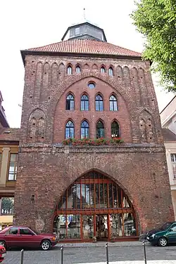 Obiekt jest masywną budowlą, na planie prostokąta. Ma wymiary: 12,3 × 10,5 metra oraz wysokość 16,8 metra. Elewację zachodnią w górnej części ozdobiono siedmioma płycinami, z których dwie mają otwory okienne. Bramę zwieńczono fryzem. Kondygnacja dola jest oddzielona od górnej poziomym, gładkim pasem. Część ta ma ostrołukowy otwór przejazdowy, który po II wojnie światowej został przeszklony. Po bokach całość wzmocniona jest skarpami. Elewacja wschodnia, od strony Starego Rynku, ma w górnej części zamurowany otwór ostrołukowy, wraz z oknami i szereg wąskich wnęk, także zwieńczonych ostrołukowo. Elewacje boczne ozdobione są dekoracyjnym fryzem i rządem blend z ostrymi łukami[2].