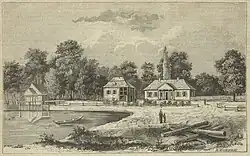 W większej odległości, ale w tej samej linii wznosił się długi budynek gospodarczy z gankiem o dwóch kolumnach i trójkątnym przyczółku, przykryty dachem dwuspadowym.