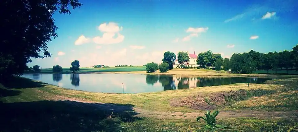 Nieopodal kościoła znajdował się folwark, który przez lata stanowił majątek rodzin Rostworowskich oraz Trębińskich. W okresie kiedy właścicielem majątku był Ludwik Rastawiecki, folwark przeszedł gruntowny remont. Wybudowany został wtedy murowany dwór w którym w 1804 roku urodził się Edward Rastawiecki. Po śmierci ojca Edward Rastawiecki sprzedał cały folwark Mieczysławowi Epstein. W późniejszym czasie folwark należał do Czesława Świeżawskiego. Ostatecznie całość folwarku wraz z dworem została spalona przez oddziały UPA w 1944 roku.